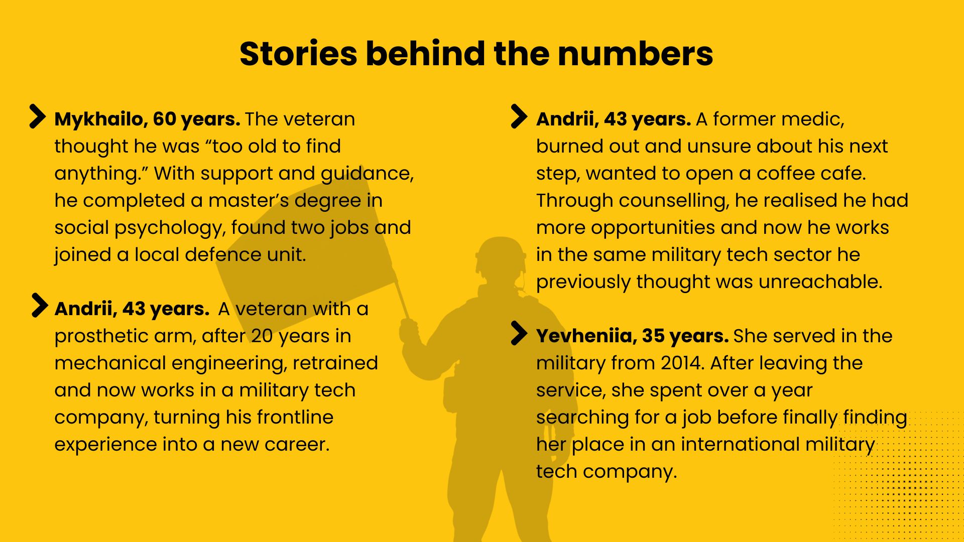 Many veterans can't return to their previous jobs or lives: some of them lost their homes or communities because of the Russian occupation of their hometown, others have injuries or disabilities that make their former work impossible.