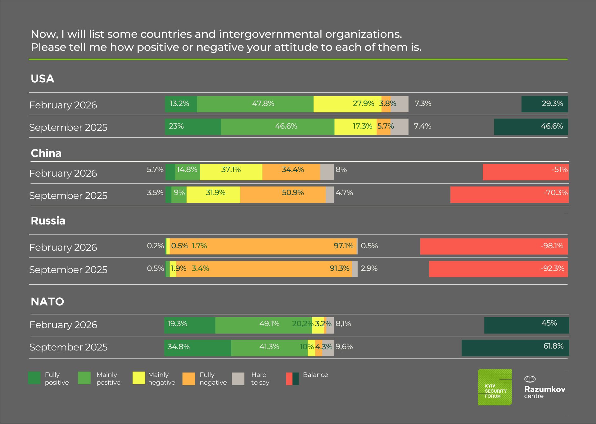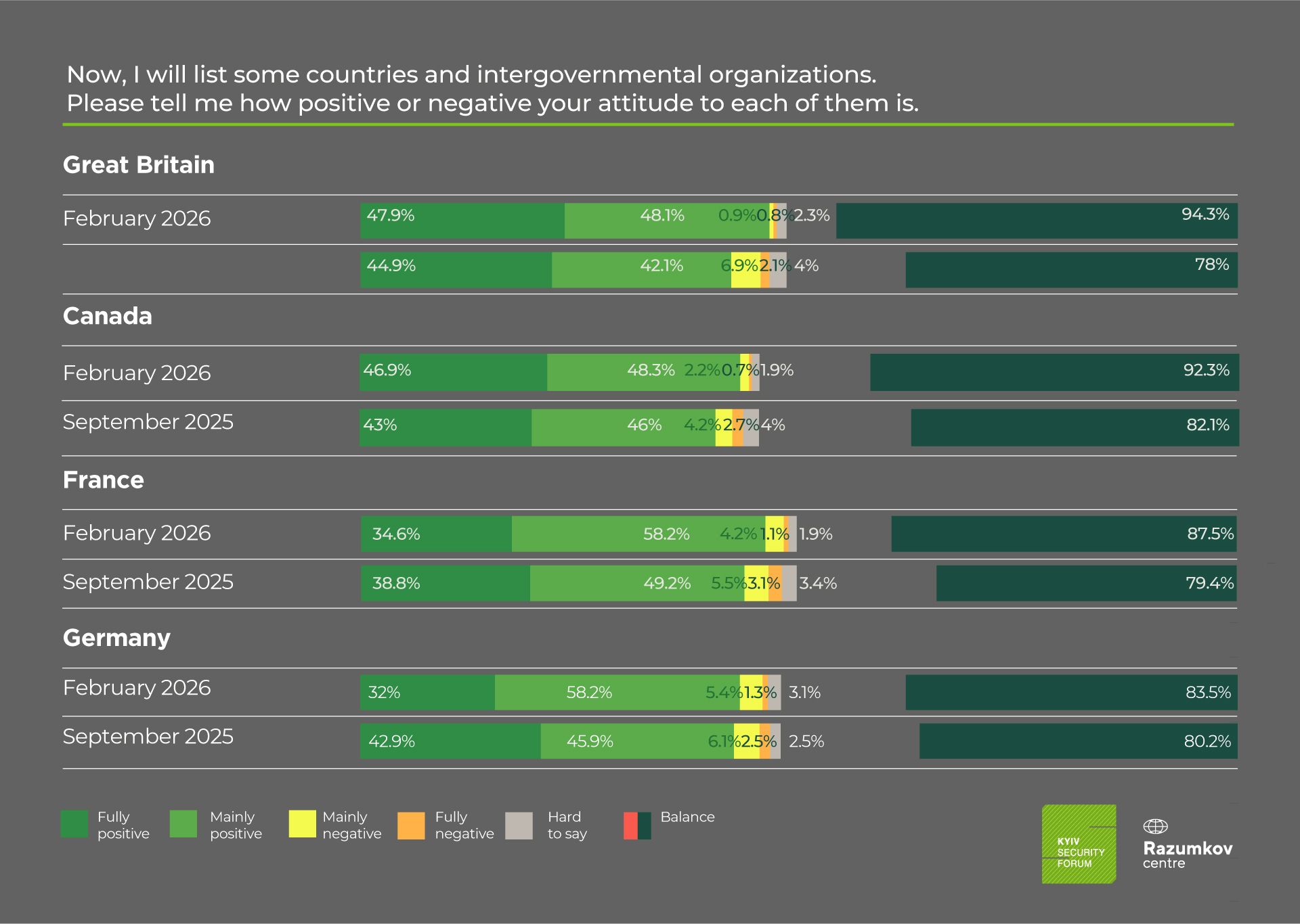 towards Great Britain, Canada, France and Germany. Negative attitudes are highest towards Russia. These are the findings of the survey commissioned by the Kyiv Security Forum and conducted by The Razumkov Center on the eve of the Munich Security Conference, which will take place on February 13-15.