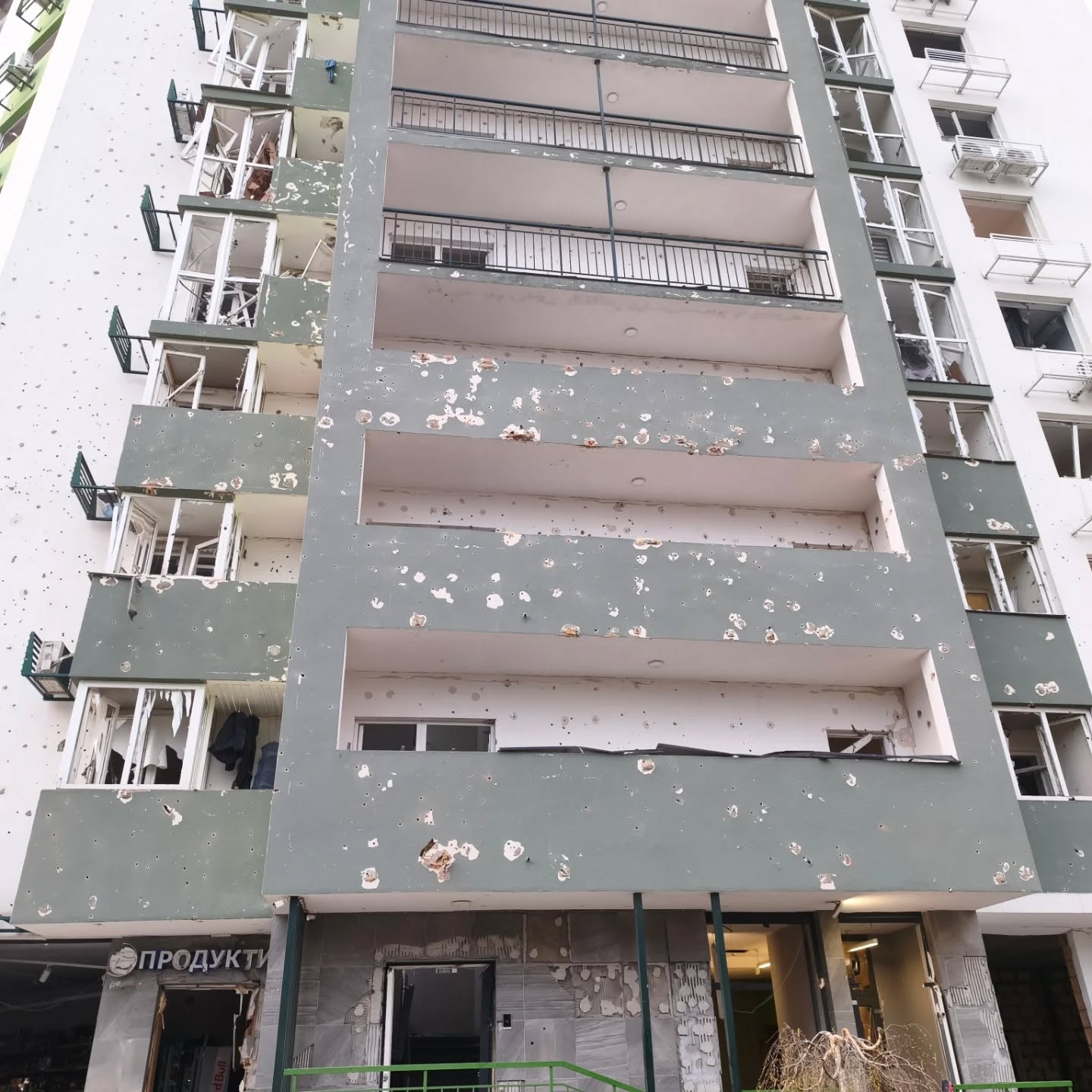 Aftermath of the Russian attack on April 16 in Kyiv. Shrapnel from cluster munitions spread across nine residential buildings, with no nearby military targets. This indicates that cluster munitions aimed to maximize civilian harm. Photo credit: Liudmyla Lohush