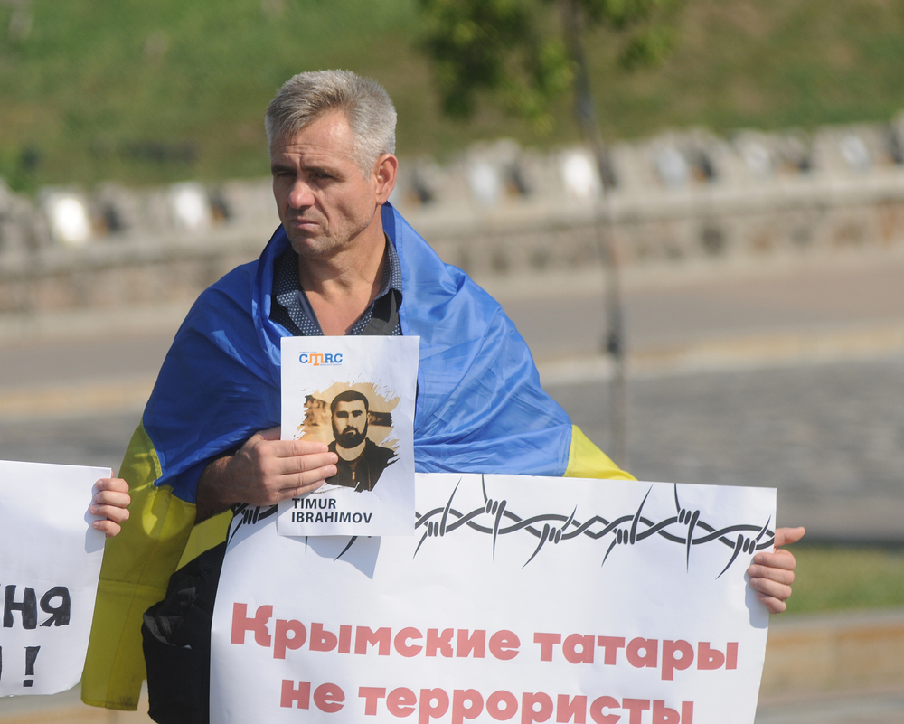 "Crimean Tatars are not terrorists": Participant of the action to support political prisoners of the Bakhchisarai case "Hizb ut-Tahrir". Shutterstock.com