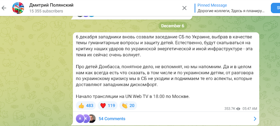 To further this narrative, Nebenzya claimed that "children from Donbas dream that they will get an end to bombings for New Year, whereas Ukrainian ask for a gun machine to kill Russians and burn the Kremlin."