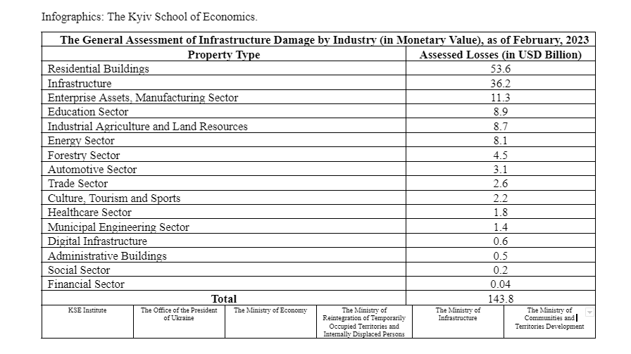According to the Kyiv School of Economics and their Russia Will Pay project, Russia has caused almost USD 144 billion damage to Ukraine’s infrastructure since the start of its full-scale invasion. A total of more than 150,000 houses and apartment buildings have been either damaged or destroyed. Losses from the destruction of the housing stock amount to more than USD 53.6 billion.