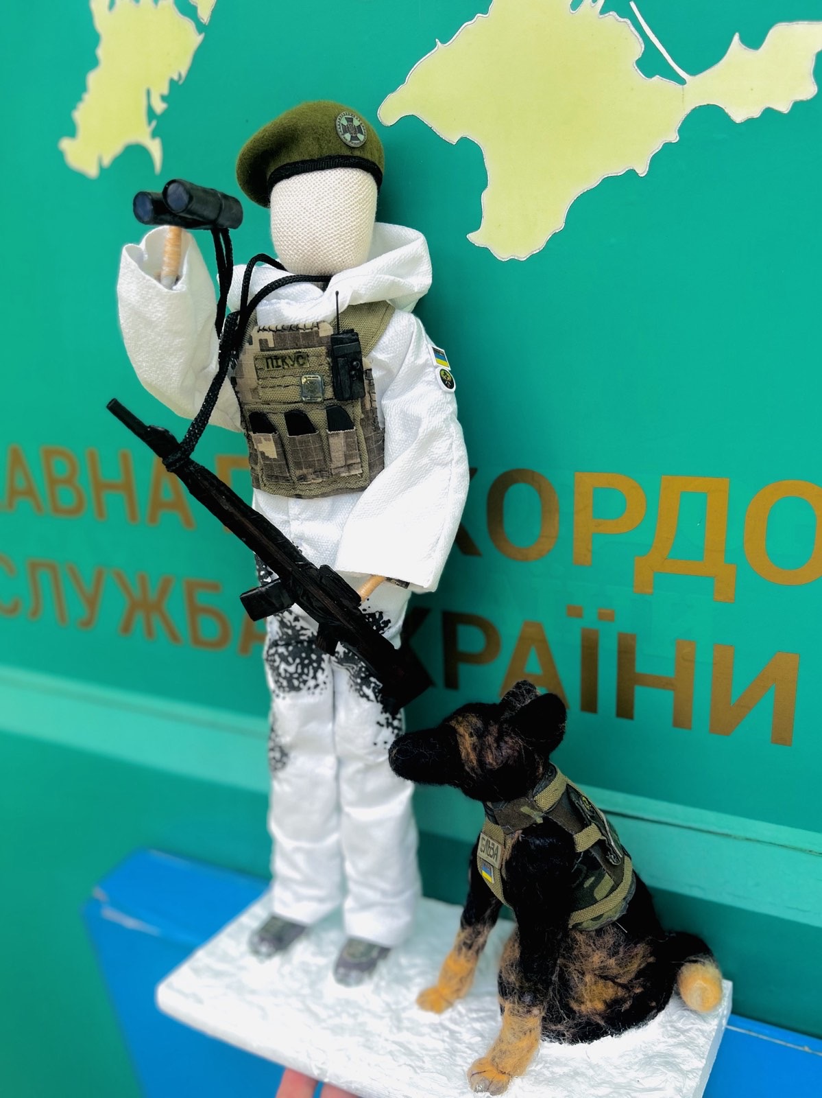 One doll portrays a border guard and his loyal shepherd, Elsa, a real-life hero rescued from missile strikes near Lyman. Today, Elsa serves alongside the 3rd detachment of the Yevhen Pikus Border Troops.
