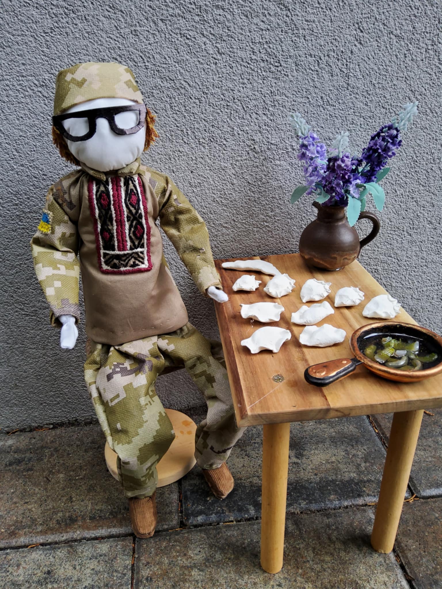 The doll is captivating: it wears a bandana and glasses, and he sits there making dumplings. There is a frying pan with onions next to it. Children who come to the exhibition always want to grab a dumpling, but it is glued."