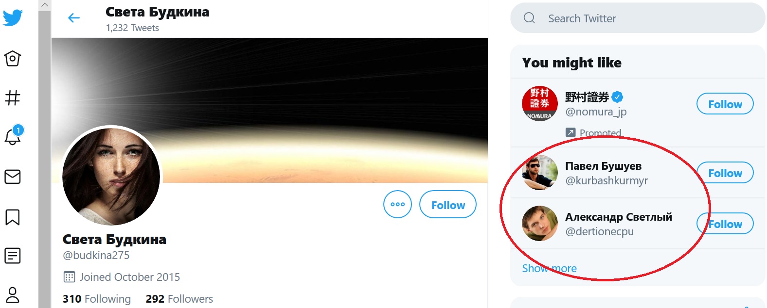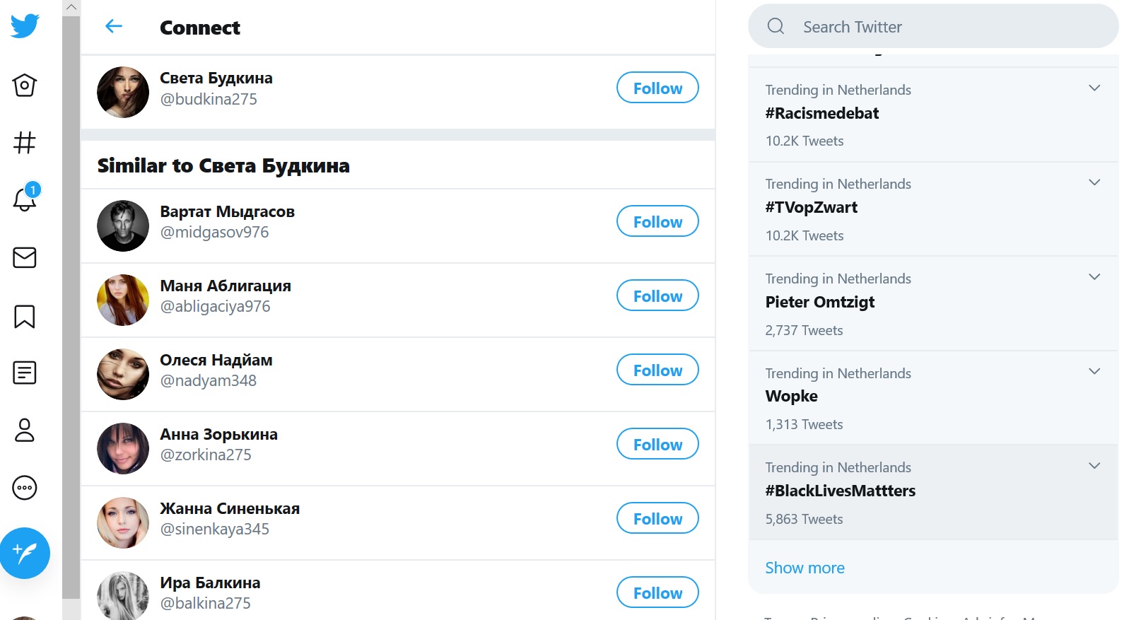 It becomes more apparent when clicking on the ‘show more’ option. Twitter’s suggested following algorithm works perfectly, and ‘show more’ offers exclusively more trolls from the same army as Budkina.