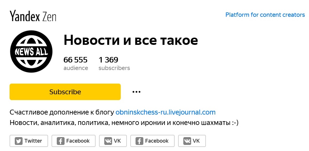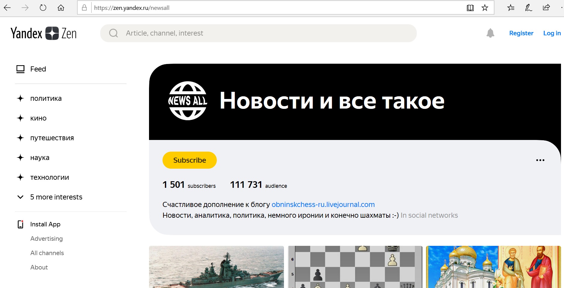 The audience indicated on the zen.yandex.ru site is 66,555, but it is not entirely clear what that means. Its subscriber count is 1,369. Obninsk chess indicates on its page that it is interested in politics in addition to chess.