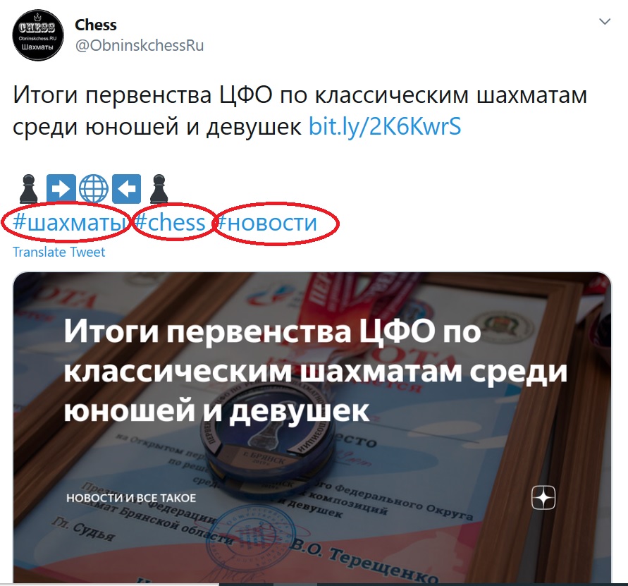 The trolls’ tweets rather curiously always use 3 hashtags that are always different. If we look at the Twitter account @ObninskchessRu, we also see that it also uses three hashtags.