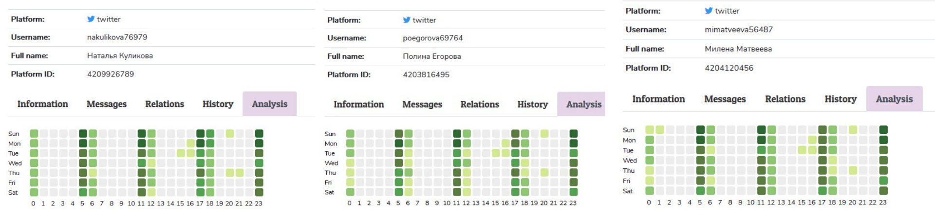It appears that budkina275 doesn’t even sleep! She seems to tweet around the clock. A similar tweet distribution can be found with the other trolls. It seems likely that this army is automated, but while the trolls tweet the same articles, they do not tweet at the exact same time. If the accounts tweet at automated times, then all the accounts have different behaviour.
