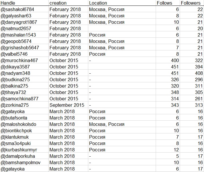 There was no location indicated on the profile for many of the bots/trolls. Those which had a profile location all listed Moscow or Russia. The trolls with around 400 followers and followed accounts are themselves followed exclusively by trolls. Thus, the size of this troll army is at least several hundred. Only a limited number of trolls retweet the zen.yandex.ru links from the Obninsky chess page.