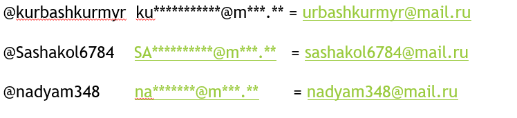 We made password recovery attempts for several dozen accounts to see what the email accounts behind them looked like. In all cases, the email address is the handle name from Twitter and the mail provider is mail.ru. So for Sveta Budkina, her email address is budkina275@mail.ru Some other examples: