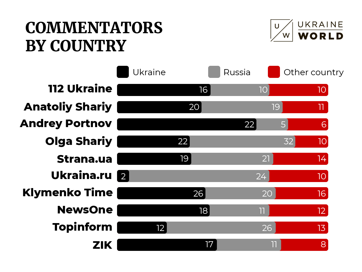 Naturally, the volume of Russia-based commenters on Russia-based YouTube channels like Украина.ру and Topinform is higher. However, it is also very significant on the channels of Anatoliy and Olga Shariy, who live in the EU and claim to be not pro-Russian, but instead pro-Ukrainian. Users from Russia also dominate on strana.ua's YouTube channel.