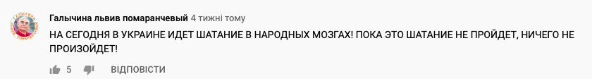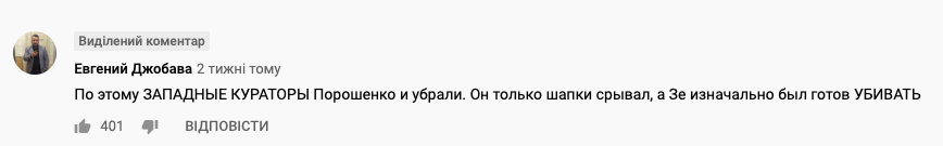 Some of these users may be real people up to ordinary internet hijinks, - but the number of comments they leave is impressive, which call their motivation into question. For instance, user Евгений Джобава (Evheniy Jobava) left 570 messages across 8 channels (all except for Украина.ру and Topinform) during the month. He is likely to be a real person: we found his Facebook account, and it appears authentic. However, he seems to be a tremendous fan of Anatoliy Shariy: 451 out of his 570 comments were left on Shariy's videos. In one of his comments, he promoted the idea of "external governance" which ostensibly has the power to to replace Ukraine's president: