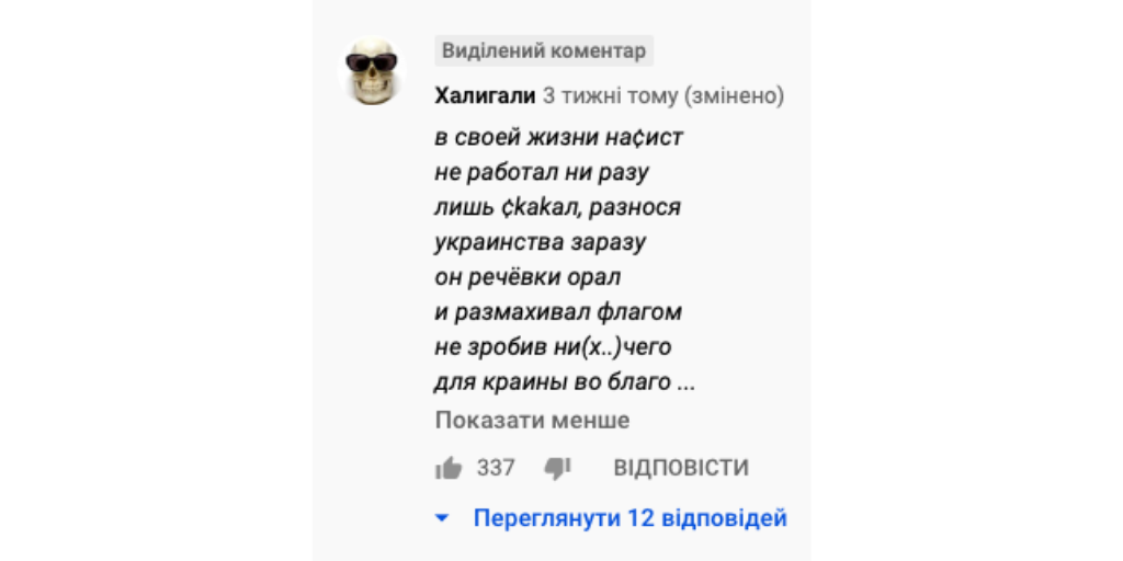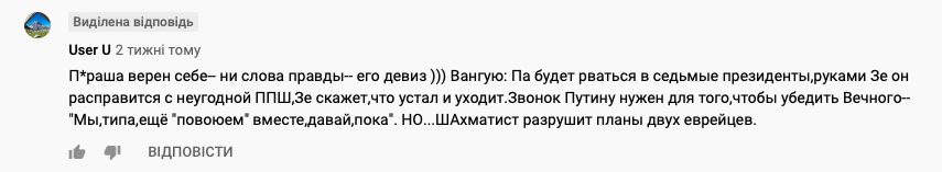 Other accounts are more suspicious, and could likely be trolls or bots. User U, who left 307 comments across 6 channels, wrote identical comments under the same video. For instance, this comment was written twice under Anatoliy Shariy's video, of titled "Poroshenko Kissed Putin's hand" (overall, we encountered this particular comment 5 times):