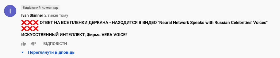"ALL THE ANSWERS TO "DERKACH TAPES" LIE IN THE VIDEO "Neural Network Speaks with Russian Celebrities' Voices". ARTIFICIAL INTELLIGENCE, VERA VOICE company"