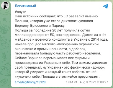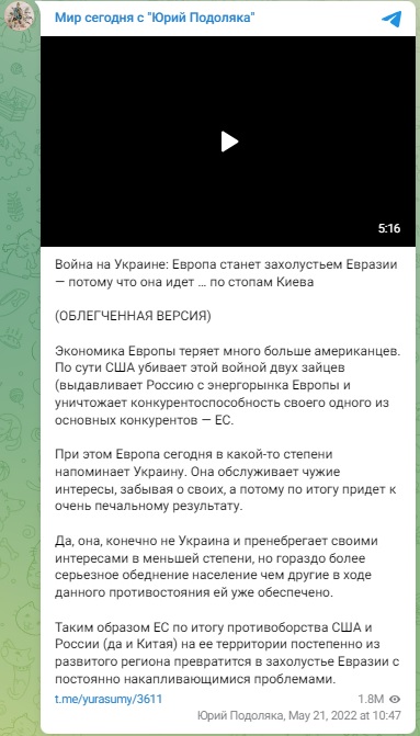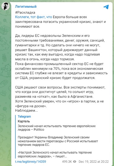 Such a message is reiterated under various wording but is one of the keys of his Telegram. Other pro-Kremlin Telegram peddlers also spread very similar ideas, such as the Eurosceptic Telegram channel, Legitymnyy. It underscores that "the Ukrainian crisis will last until the financial and defence sectors of the EU are at least 70% weak, holding the parallel between the EU's capability and the war in Ukraine." Moreover, pro-Kremlin channels also propagate that "the US has its own interests in the war in Ukraine, and achieving them will stiffen the EU."