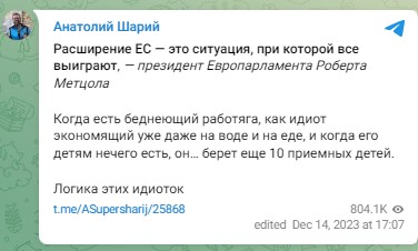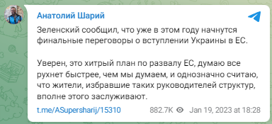 The leading narrative among pro-Kremlin Telegram peddlers is that the "political, economic situation in the EU becomes worse and worse with every day". For instance, on his Telegram channel, former Ukraine's politician, Anatolii Sharii, who is accused of treason in Ukraine, writes "With Ukraine, the EU will become poorer and poorer".