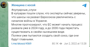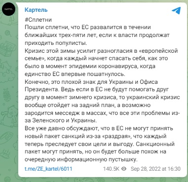 For instance, pro-Russian Telegram channel Mir Segodnia z Yurii Podoliak wrote, "In the struggle between Russia and the US on the territory of Europe, the EU will turn into a wasteland of Eurasia with more and more problems''. Later Telegram channels Zhenshchina z Kosoi and Kartel claimed that "the EU would fall apart for 3-5 years and cease to exist in 2030."