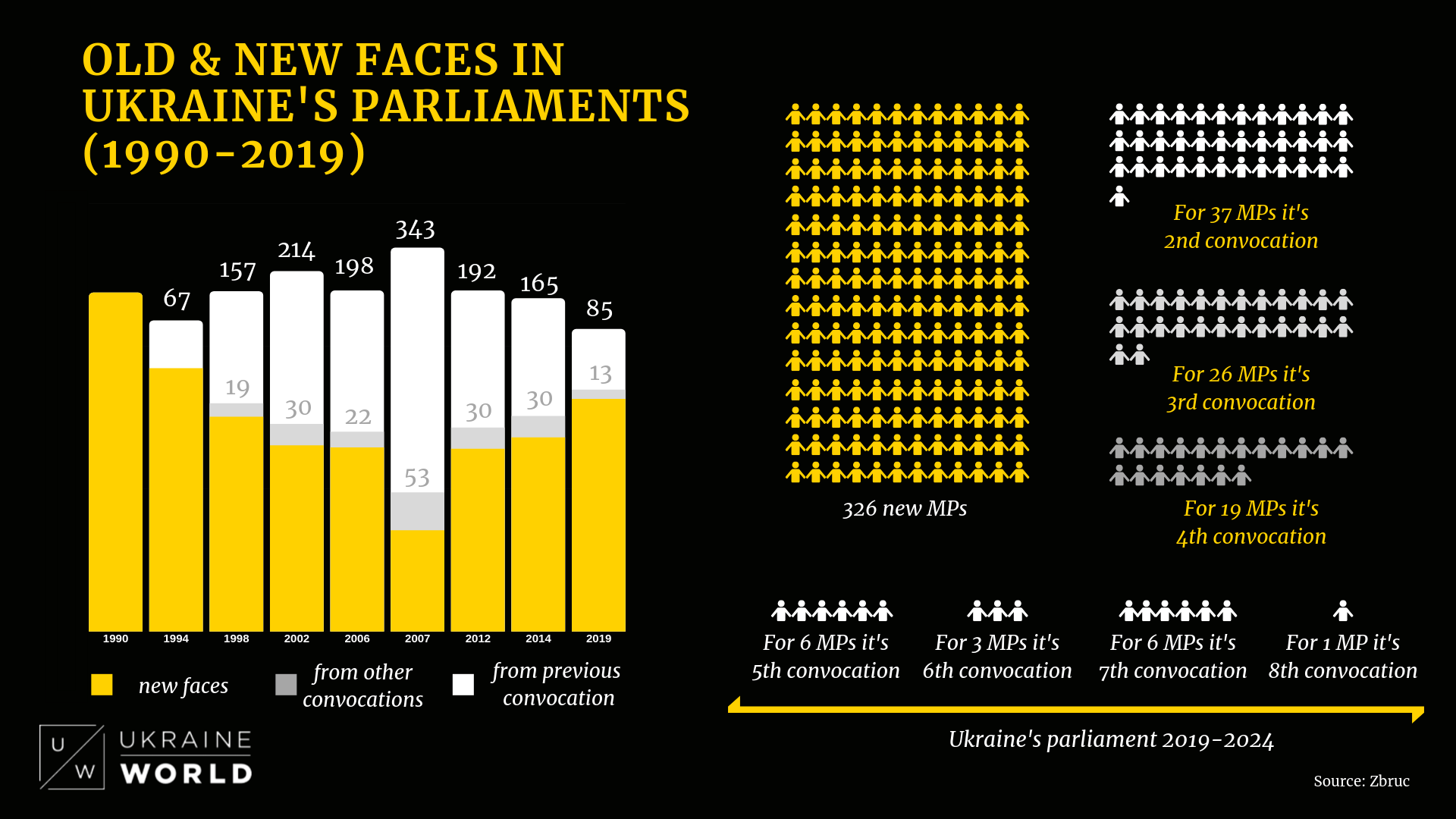 However, against the backdrop of one of the biggest parliamentary reboots in Ukraine's history, this is the first time that so many people with no political background connected to work in Parliament have entered the Verkhovna Rada of a new convocation. There was only one case, in 1994, when Parliament gathered almost 85% of "new faces" if compared to the elections in 1990; however, it is rather the exception, as the Rada elections in 1994 were held for the first time since the Declaration of Independence of Ukraine in 1991.