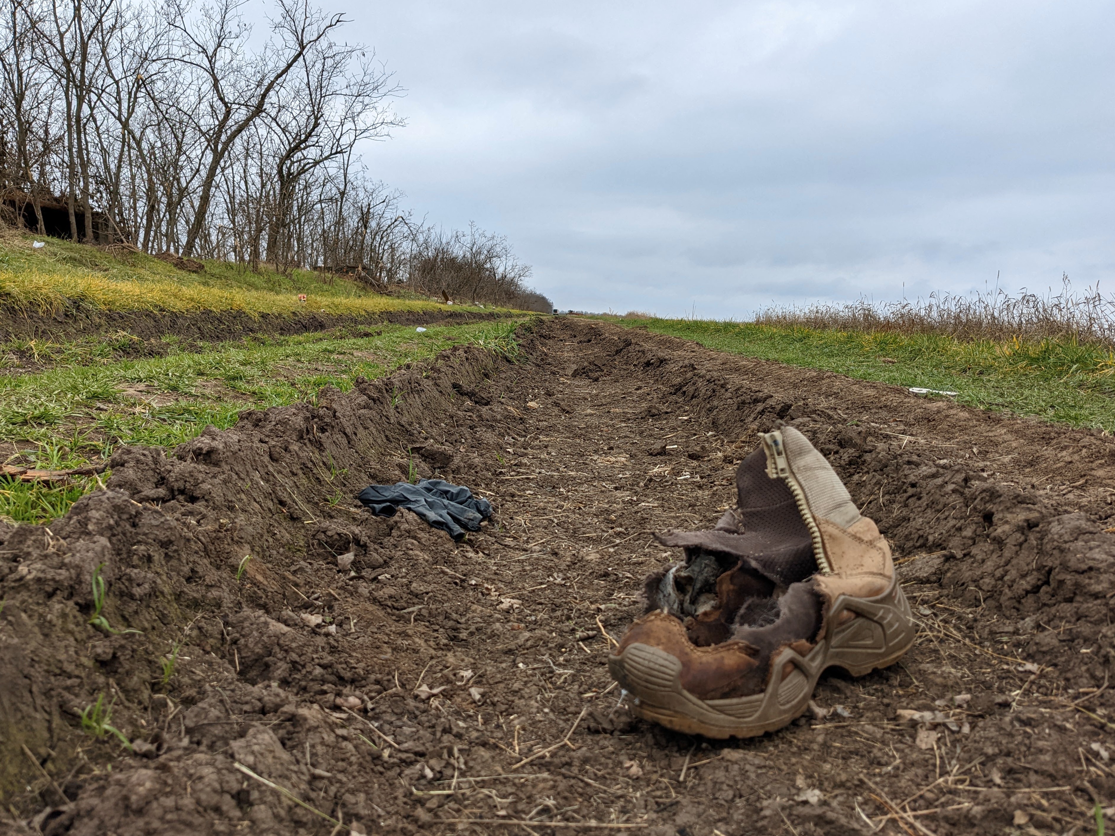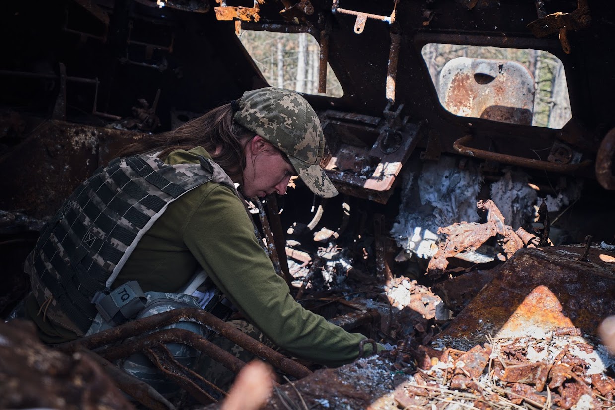 No matter what is in front of her, be it a burned-out vehicle or a blackened spot of earth despoiled by fire and explosives, Kateryna searches through anything to find organic and non-organic signs of the past life.