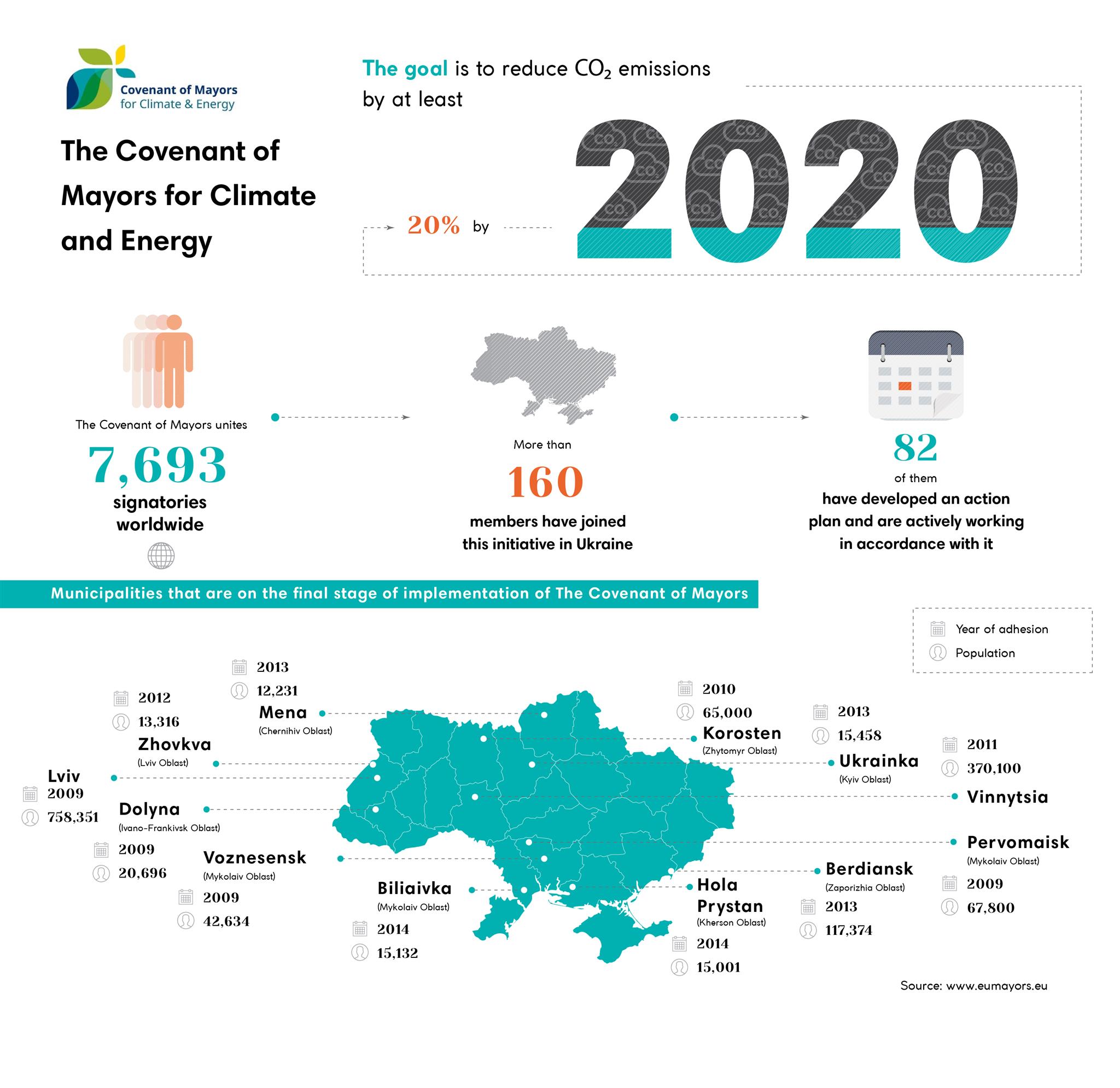 One of the first Ukrainian cities that joined the Covenant of Mayors at the end of 2008 was Kamianets-Podilskyi. In 2009, the other 11 cities that joined the initiative were: Bakhmut (Donetsk Oblast), Dolyna (Ivano-Frankivsk Oblast), Lviv, Kovel (Volyn Oblast), Lutsk, Kherson, Pervomaisk (Mykolaiv Oblast), Pryluky (Chernihiv Oblast), Slavutych (Kyiv Oblast), Voznesensk (Mykolaiv Oblast), Zhmerynka (Vinnytsya Oblast).