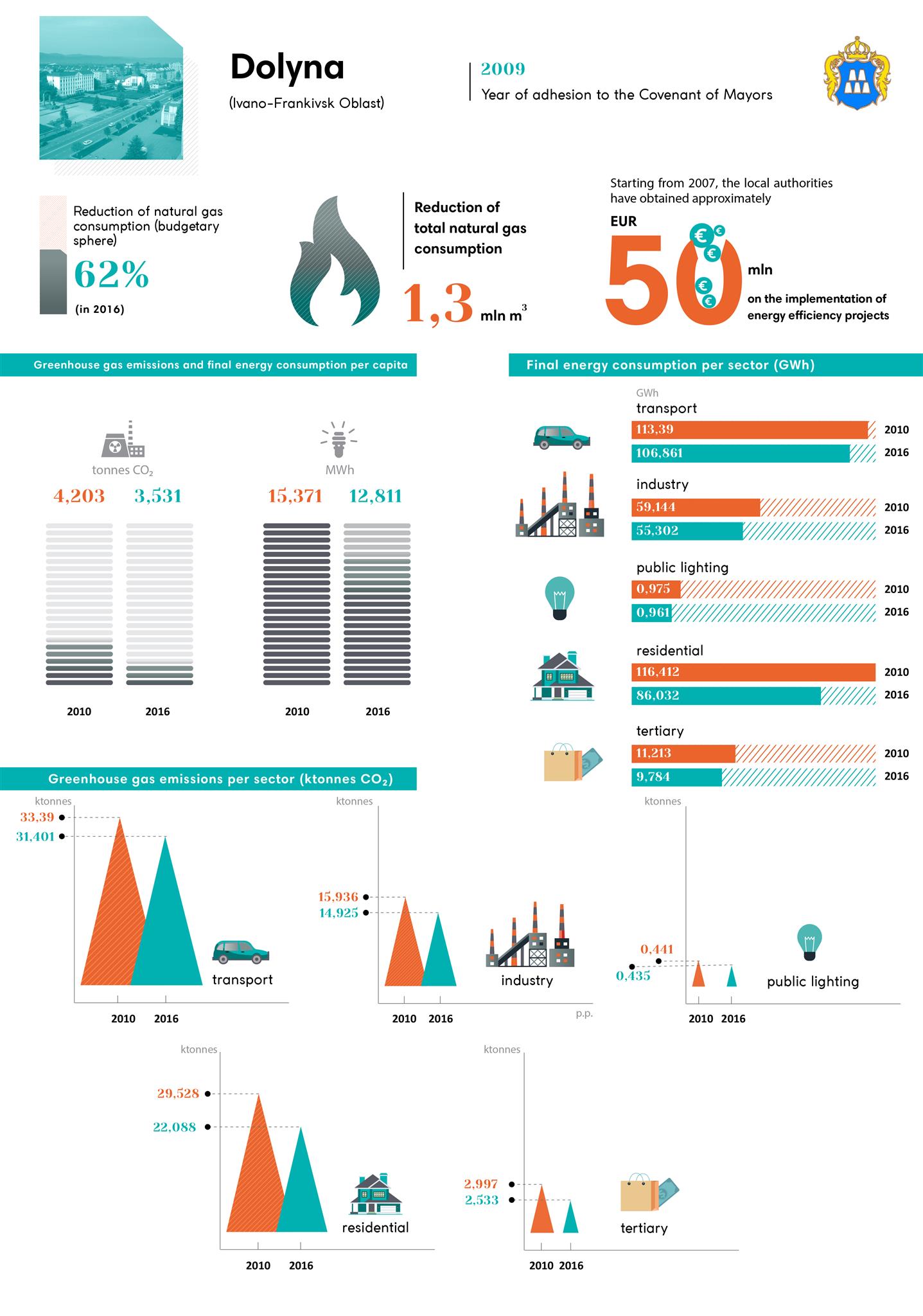 The following cities have managed to make great progress in implementing energy efficiency and reducing CO2 emissions: 1) With a population under 25,000: Dolyna (Ivano-Frankivsk Oblast), Zhovkva (Lviv Oblast); 2) With a population under 50,000: Voznesensk (Mykolaiv Oblast), Myrhorod (Poltava Oblast); 3) Among administrative centres: Lviv, Vinnytsya, Lutsk, Zhytomyr.