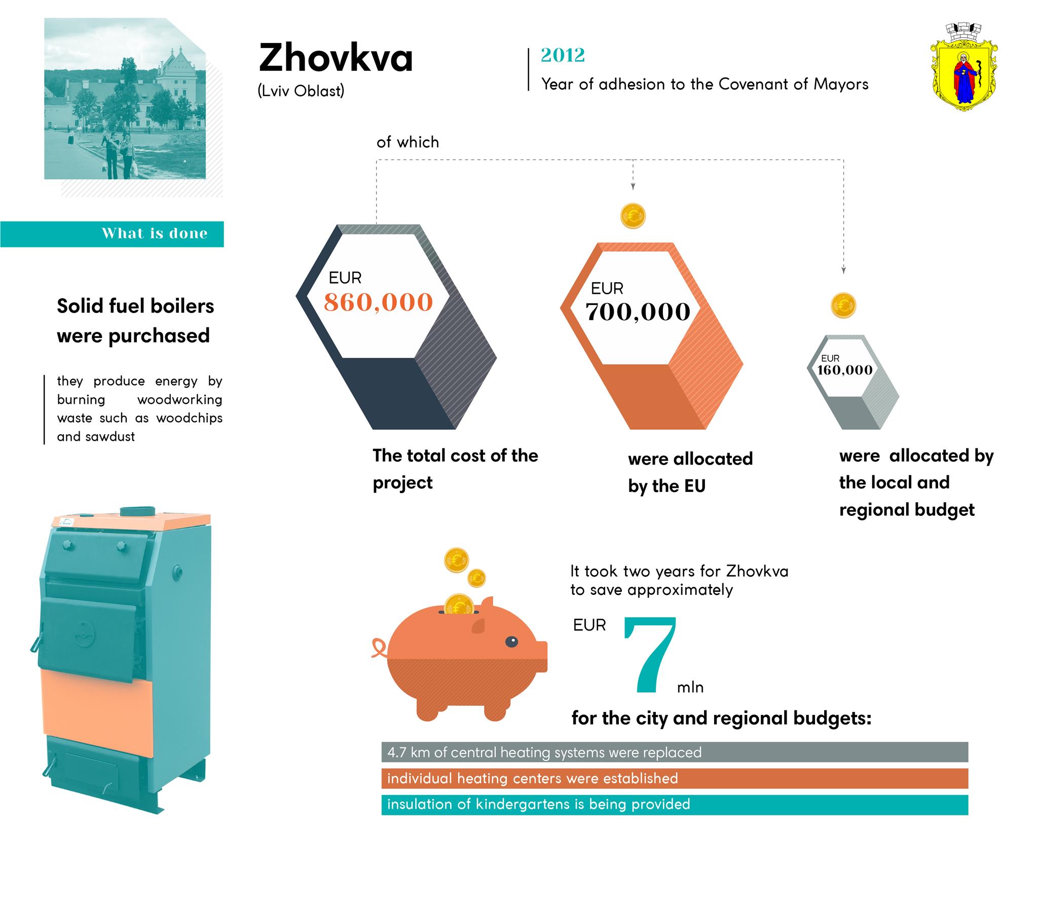 Zhovkva, a small town located in Lviv Region, managed to significantly cut down on its use of natural gas for heating purposes thanks to the implementation of projects on increasing energy efficiency. The allocated grant funds enabled the purchase of solid fuel boilers that produce energy by burning woodworking waste such as woodchips and sawdust. The total cost of the project is EUR 860,000, of which EUR 700,000was allocated by the EU and the rest by the local and regional budget. It took two years for Zhovkva to save approximately UAH 7 mln for the city and regional budgets. Moreover, with European support, the authorities were able to replace 4.7 km of central heating systems, establish individual heating centers, which enable permanent temperature control in automatic mode and insulate kindergartens.