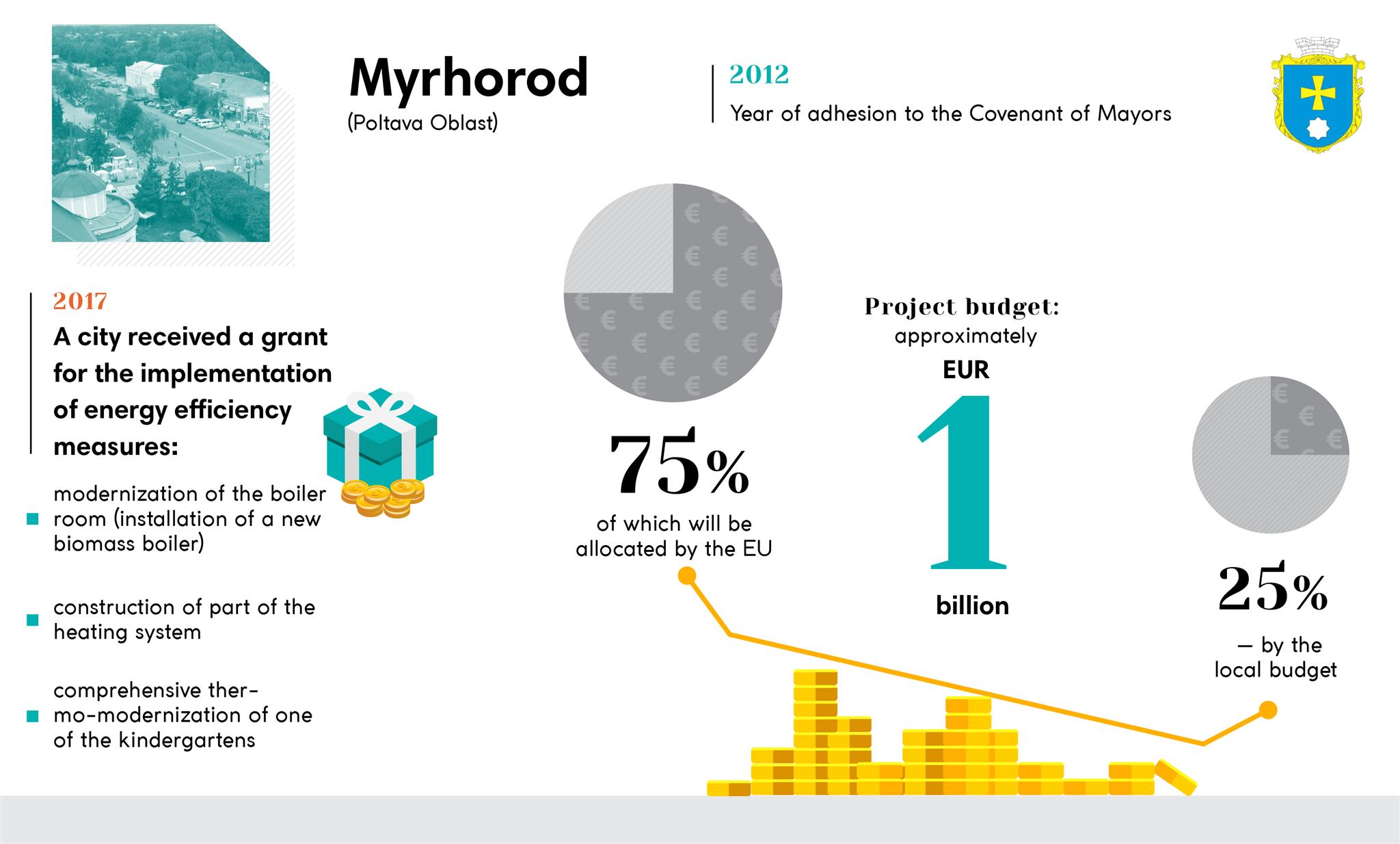 Myrhorod, a city that has been a member of the Covenant of Mayors since 2012, recently received a grant from the European Commission for the implementation of energy efficiency measures, in particular: modernization of the boiler room (installation of a new biomass boiler), construction of part of the heating system, and carrying out the comprehensive thermo-modernization of one of the kindergartens. The implementation of the aforementioned plans requires approximately EUR 1 billion, 75% of which will be allocated by the EU and the rest by the local budget.