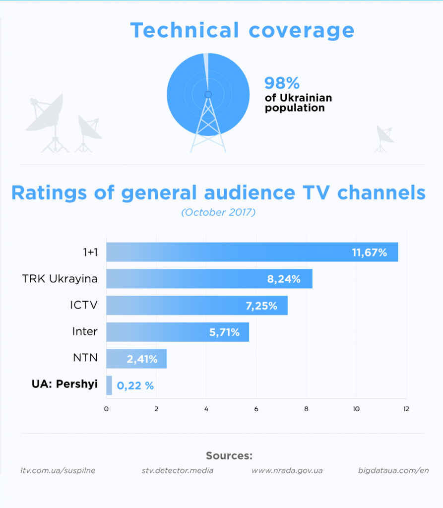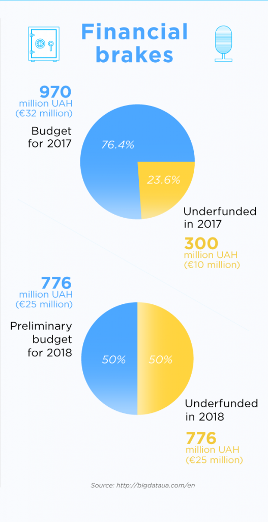 The worst part is that the government wants to give the broadcaster even less in 2018. According to the 2018 state budget, the Cabinet of Ministers and the Verkhovna Rada allocated 776 million hryvnias (nearly 25 million euros), while the law on public broadcasting sets Suspilne's budget at 1,535 billion hryvnias in 2018.