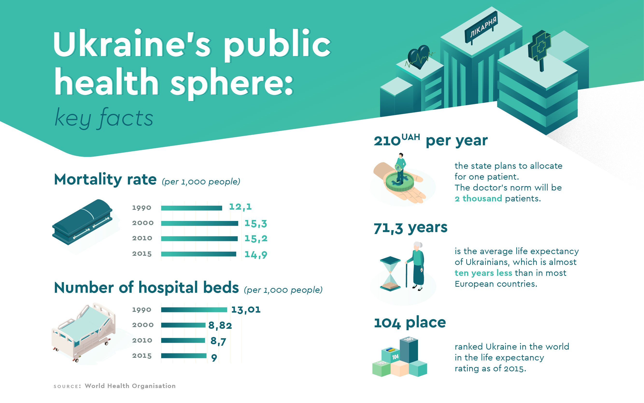 During the years of independence, Ukraine hasn't been able to create a healthcare system that can effectively provide the population with quality and affordable medical services, respond to the current challenges related to increasing mortality rates and the spread of AIDS, tuberculosis or hepatitis C, and to carry out effective preventive measures. Today, despite high levels of state expenditure on the medical sector, citizens are forced to pay for expensive treatment on their own. For the disadvantaged section of the population, the payment of medical services is often excessive.