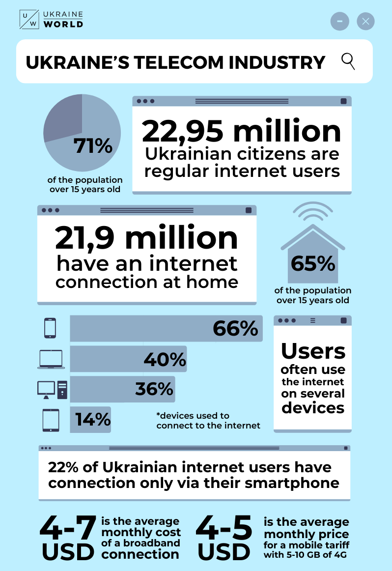 One of the factors which allow for such a relatively high internet penetration figure is very low cost of services. The average cost of a broadband internet connection is 100-200 UAH (4-7 USD) per month --- higher in big cities and lower in the small towns. Meanwhile, the average price for a mobile tariff with 5-10 gigabytes of 4G internet is 100-120 UAH (4-5 USD) per month. While this is good for consumers, it is a problem for telecom providers.