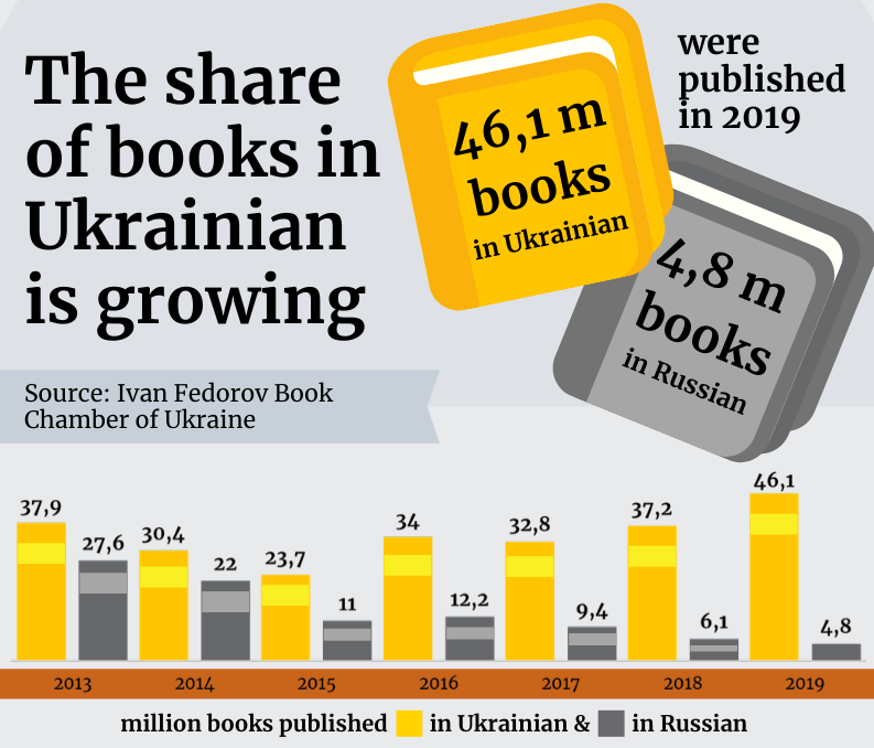 The Ukrainian-language book market is growing, along with the share of books in Ukraine published in Ukrainian. According to the Ivan Fedorov Book Congress of Ukraine, in 2019, 46,1 million books were published in Ukrainian, with 4,8 million in Russian. Let's look at how the figures have evolved over the last few years: