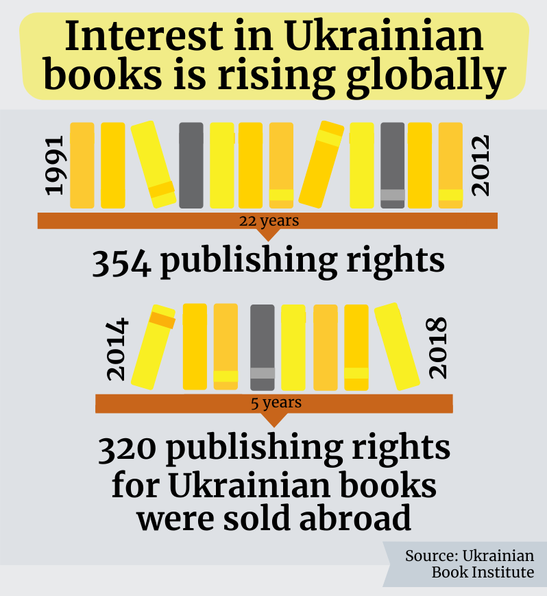 Interest in Ukrainian books is rising around the world, as well. According to the Ukrainian Book Institute, in the period between 1991 and 2012, 354 publishing rights for Ukrainian books were sold abroad. However, between 2014 and 2018, 320 rights were bought by foreign publishing houses.
